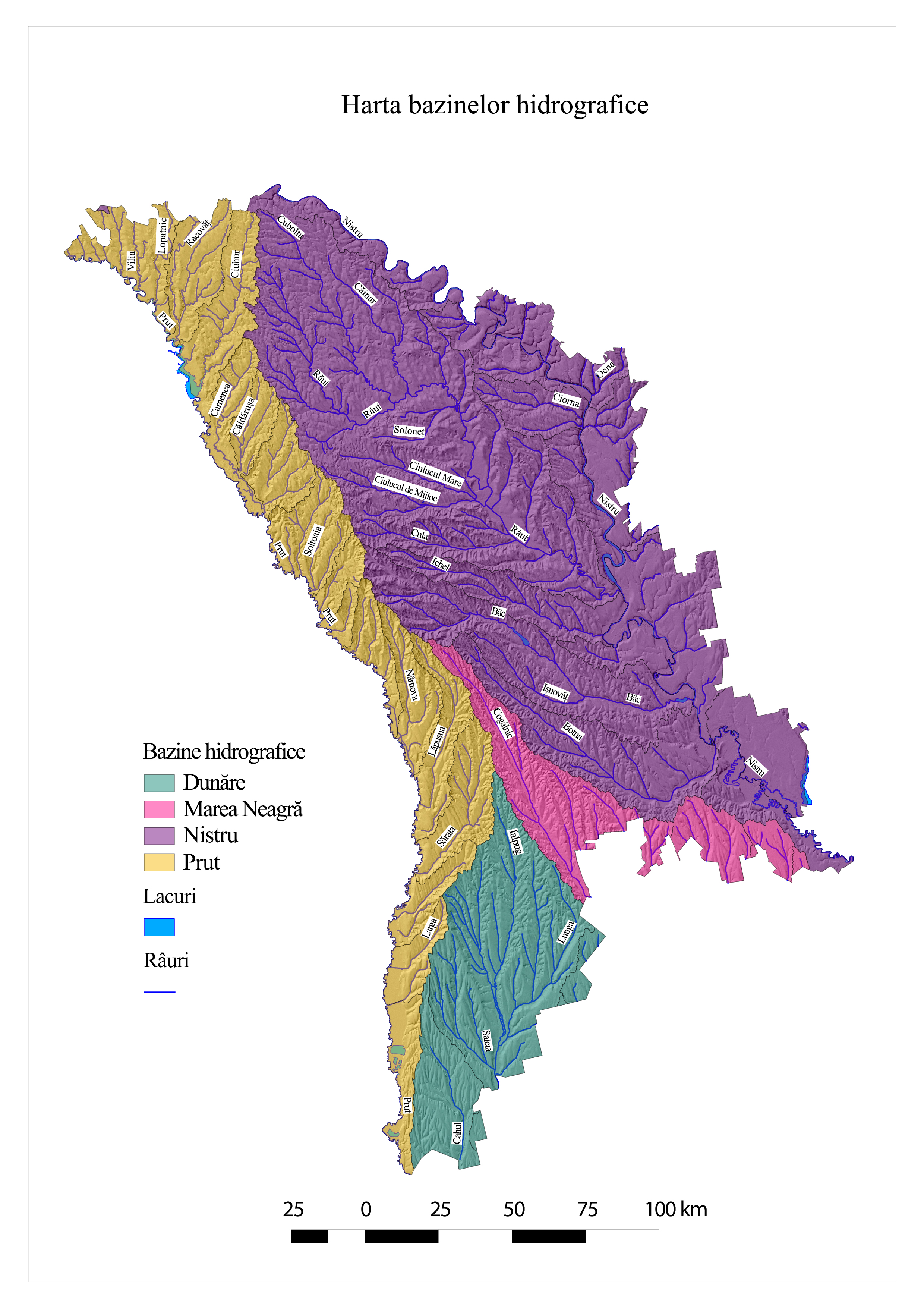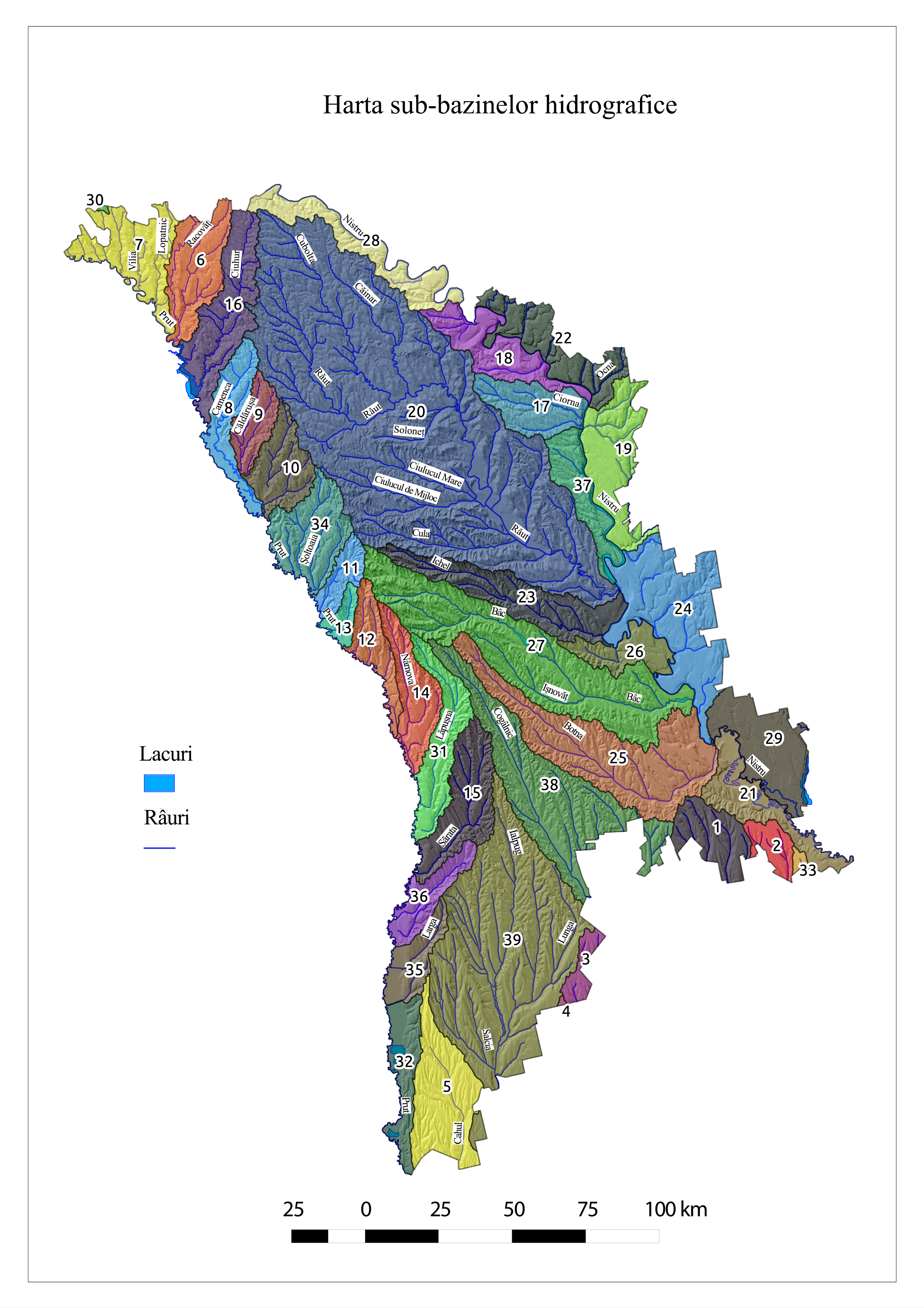 All aquatic objects: rivers, canals, lakes, reservoirs and ponds are considered surface waters and are considered the national property of the Republic of Moldova. The Water Law no. 272 of 23.12.2011, article 5 provides the following: The water resources management provides that the hydrographic district is the main unit for the management of the river basins and of the associated groundwater; the sub-basins, in their turn, are delimited in districts. Government Decision no. 775 of 04.10.2013 regarding the boundaries of the river basin and sub-basin districts and the special maps in which they are determined, acting on the basis of the Water Law no. 272 of 23.12.2011, delimited the boundaries of two hydrographic districts: Prut and Dniester. Within these hydrographic districts are included 4 hydrographic basins: the Danube, the Black Sea, Prut and Dniester. In these hydrographic basins, in their turn, 39 hydrographic sub-basins are distinguished: Sărata, Hagider, Chirghiş-Chitai, Catlabuh, Cahul, Racovăţ, Vilia-Lopatnic, Camenca, Căldăruşa, Şovăţ, Delia, Bratuleanca, Varşava, Nîrnova, Sărata, Ciuhur, Ciorna-Rezina, Racovăţ-Sănătăuca-Alcedar, Rîbniţa-Iagorlîc, Răut, Nistru Vechi-Ştiubei-Liman, Ocniţa-Ocna, Ichel, Iagorlîcul Uscat-Comarova, Botna, Bălţata-Șerpeni, Bîc, Naslavcea-Vasilcău, Colcotov-Cuciurgan, Nistru, Lăpuşna, Frumoasa-Crihana, Alcalia, Gîrla Mare-Şoltoaia, Larga, Tigheci, Saharna-Jidauca, Cogîlnic, Ialpug.